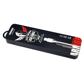 該款長方形數據線翻蓋式鐵盒包裝采用0.23mm鍍錫馬口鐵制作,客戶可根據自身需求,選擇0.23-0.28mm的馬口鐵/磨砂鐵制作,若選擇磨砂鐵制作鐵盒可使得材質表面有強烈的沙礫效果,在觸感上會變得更加有感覺。