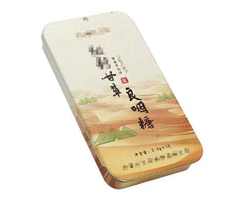 方形滑蓋甘草良咽糖鐵盒_麥氏罐業食品鐵盒包裝——麥氏罐業有限公司,擁有十二年制盒經驗、五百多臺制盒設備、十多名模具開發師傅、三百多名訓練有素的操作工、五條自動化制盒生產線、2000平方米的包裝車間、五十多名銷售精英、一站式鐵盒包裝供應商、20天內完成,長方形保健品鐵盒定制熱線:18676322818.