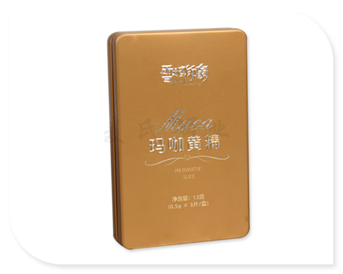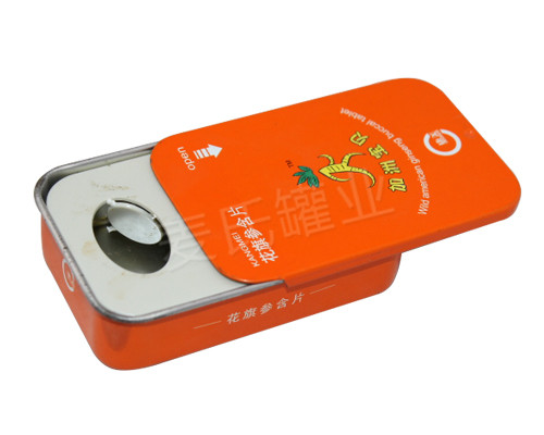 這款滑蓋人參片鐵盒包裝,采用國產0.23mm馬口鐵精心打造而成,具有良好的防腐性,密封性,抗壓性等特點。此款鐵盒為滑蓋長方形造型設計,推拉兩片罐結構,此款鐵盒有激凸功能,使鐵盒外觀效果更具影響力。