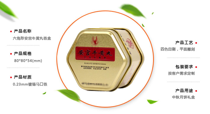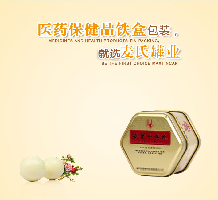 六角形安宮牛黃丸鐵盒,是用來(lái)包裝存放安宮牛黃丸的一種金屬包裝鐵盒,印刷美觀,適宜保存,批發(fā)價(jià)格低,麥?zhǔn)瞎迾I(yè)可定制各種尺寸相關(guān)六角形安宮牛黃丸鐵盒,是牛黃丸包裝盒生產(chǎn)加工廠家。