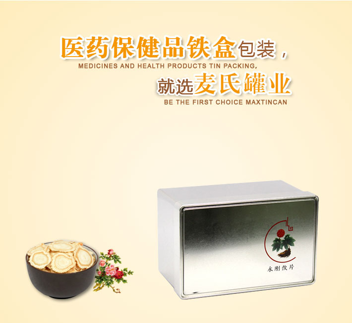 人參破壁飲片鐵盒-保健品鐵盒系列-鐵盒,鐵罐,鐵盒包裝 ,鐵盒廠家,印鐵制罐廠—麥氏罐業有限公司:尺寸: 154*100*90mm 材質:包裝方式:每個放在塑料袋里面,或者根據客戶的要求印刷:四色印刷或專色印刷,或者根據客戶的需求厚度:0.23mm。